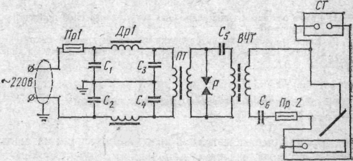 СТ — зварювальний трансформатор, Пр1, Пр2 — запобіжники, Др1|, Др2 — дроселі, С1 — С6 — конденсатори, ПТ — трансформатор, що підвищує, ВЧТ — високочастотний трансформатор, P — розрядник