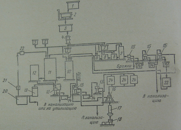 Технологическая схема дрожжевого производства с использованием бражки: 1 - сборники для мелассы: 2 - весы; 3 - сборник для разбавления мелассы;4 - кларификатор: 5 - сборник для раствора диаммонийфосфата; 6 - сборник для раствора сернокислого аммония; 7 - приточные сборники для осветленной мелассы; 8 - отделение чистой культуры дрожжей; 9 - дрожжерастильный аппарат дрожжей ЧК и ЕЧК; 10 - дрожжерастильный аппарат I стадии товарных дрожжей: 11 - дрожжерастильный аппарат II стадии товарных дрожжей; 12 - отборочный аппарат; 13, 15 - дрожжевой сепаратор; 14 - промывные бачки: 16 - фильтр-пресс или вакуум-фильтр: 17 - бункер: 18 - формовочно-упаковочный автомат: 19 - песчаный фильтр; 20 - сборник для бражки, направляемой в оборот; 21 - аппарат СВЧ для стерилизации бражки, направляемой в оборот; 22 - мерник для бражки; 23 - сборник дрожжевого молока маточных дрожжей; 24 - сборник дрожжевого молока товарных дрожжей.