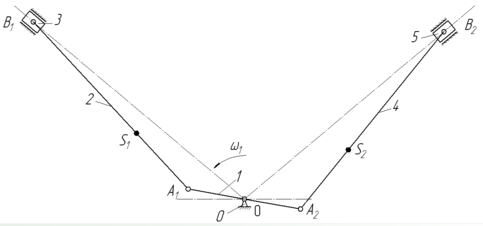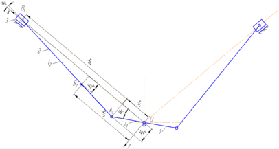 Кинематическая схема механизма приведена на рис. 1.3.1. Направляющие ползунов наклонены относительно системы координат