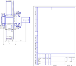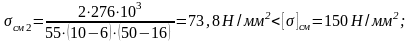 Cтp=P∙2.785=11,078∙2,785=30 кН; Стр=30,85 Следовательно, окончательно принимаю подшипник легкой серии №212, у которого коэффициент динамической грузоподъемности С= 41 кН. 6. РАСЧЕТ И ПОДБОР ШПОНОЧНЫХ СОЕДИНЕНИЙ РЕДУКТОРА Для передачи крутящих моментов применяю шпонки призматические со скругленными торцами по ГОСТ 23360. вал I Ø32 мм b x h x l = 10 x 8 x 50 вал III Ø55 мм b x h x l = 16 x 10 x 50 Ø45 мм b x h x l = 14 x 9 x 50 вал IV Ø65 мм b x h x l = 20 x 12 x 70 Ø55 мм b x h x l = 16 x 10 x 70 Материал шпонок – сталь 45 нормализованная. Проверяю шпонки на прочность. Условие прочности: Вал II (быстроходный). Шпонка 10 х 8 х 50 ГОСТ 23360: Вал III (промежуточный). Шпонка 16 х 10 х 50 ГОСТ 23360: Шпонка 14 х 9 х 50 ГОСТ 23360: Вал IV (тихоходный). Шпонка 20 х 12 х 70 ГОСТ 23360: Шпонка 16 х 10 х 70 ГОСТ 23360: Прочность обеспечена. Ведомость выбранных шпонок. № вала dв Размеры шпонок по ГОСТ 23360 Момент, передаваемый валом. мм Н/мм2 мм Н∙мм II – быстро-ходный 32 45 10 х 8 х 50 87,72∙103 III – промежу-точный 45 97 14 х 9 х 50 276∙103 III – промежу-точный 55 73,8 16 х 10 х 50 276∙103 IV – тихо-ходный 55 146 16 х 10 х 70 869∙103 IV – тихо-ходный 65 118 20 х 12 х 70 869∙103 7. ВЫБОР И РАСЧЕТ МУФТЫ ПРИВОДА Выбираю упругую пальцевую муфту. Эта муфта допускает радиальную несоосность валов до 0,4 мм и угловую до 1о за счет деформации неметаллических пальцев и некоторого сдвига их относительно сопряженных металлических деталей. Муфта обеспечивает смягчение толчков, компенсацию монтажных неточностей и биений соединенных валов. Полумуфты насаживают на конец вала с натягом по посадке j6 на призматической шпонке 16 х 10 х 70. В одной полумуфте на конических хвостовиках закреплены пальцы с надетыми на них резиновыми втулками, которые входят в цилиндрические расчеты другой полумуфты. Материал полумуфт – чугун СЧ20 ГОСТ 1412-85 пальцы из нормализованной стали 45 ГОСТ 1050-88, а втулки из специальной резины. Пальцы проверяю на изгиб: Тр – расчетный момент, Н∙мм. Окружная сила, передаваемая одним пальцем: dn= 25 мм – диаметр пальца; Условие прочности соблюдено. Условие прочности втулки на смятие: 8. СОСТАВЛЕНИЕ ВЕДОМОСТИ ПОСАДОК СОПРЯЖЕНННЫХ РАЗМЕРОВ Выбор посадок посадочных мест подшипников. В редукторе применяю подшипники 0 класса точности. Посадки колец шарикоподшипников выбираю от вида нагружения – циркуляционного: - внутреннего кольца на вал – L0/k6; - наружного кольца в корпус – N7/L0. Выбор посадок зубчатых колес Зубчатые колеса насаживаю на вал по посадке r6 по системе отверстия 7-го квалитета точности – Н7/r6. Выбор посадок шкивов ременной передачи Шкивы ременной передачи на вал насаживаю по посадке jS6 по системе отверстия 7-го квалитета точности – Н7/jS6. Выбор посадок крышек торцовых узлов на подшипниках качения Крышки торцовые устанавливаю в корпусе и крышке редуктора по посадке Н7/Н8. Ведомость посадок сопряженных размеров № Сопрягаемые детали Диаметр и посадка сопряжения Количество сопряжений Примечания Вал-подшипник 35 L0/k6 2 Корпус-подшипник 72 N7/L0 2 Вал-подшипник 50 L0/k6 2 Корпус-подшипник 90 N7/L0 2 Вал-подшипник 60 L0/k6 2 Корпус-подшипник 110 N7/L0 2 Вал-шкив 32 H7/jS6 1 Вал-муфта 55 H7/n6 1 Крышка-корпус 72 H7/h8 2 Крышка-корпус 90 H7/h8 2 Крышка-корпус 110 H7/h8 2 Вал-зубчатое колесо 45 H7/r6 1 Вал-зубчатое колесо 55 H7/r6 1 Вал-зубчатое колесо 65 H7/r6 1 9. СИСТЕМА СМАЗКИ РЕДУКТОРА Поскольку окружная скорость зубчатых колес до 12…14 м/с, то смазку осуществляю путем погружения зубчатых колес в масло, заливаемое внутрь корпуса. Глубину погружения колес в масло принимаю равной 0,12 радиуса 