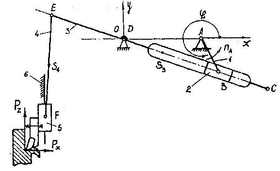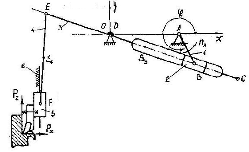 Принцип дії механізму: Обертання вiд електродвигуна через планетарну передачу (колеса 1,2,3,4 i водило H) i пару колiс 5 i 6 (рис. 2). Вiд кривошипа рух передаеться повзуну 5 кулiсного шестиланкового механiзму передаеться головному валу А, на якому крiм колеса 6 установлений кривошип 1 важiльного механiзму (рис. 1) i кулачок (рис. 3) закрiплений рiзець, що здiйснюе технологiчну операцiю. З боку оброблюваноi деталi на рiзець дiє сила рiзання, що має двi складовi Pz, Px (третьою складовою Рy зневажаемо), причому Px =(0,3 ÷ 0,5 )*Pz . На рис.5 приведена дiаграма змiни сили рiзання, що дiє на робочому ходi, який відповiдає руху повзуна 5 униз . Кулачковий механiзм (рис. 3) призначений для поперечноi подачi столу