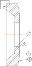 | 020. Токарна з ЧПК 1.Підрізати торець 1 однократно. 2.Підрізати торець 5 попередньо. 3.Підрізати торець 5 кінцево. 4. Розточити отвір 7 попередньо. 5. Розточити поверхню 3 Попередньо на конус. 6. Розточити поверхню 3 кінцево на конус. 7. Розточити канавку 4. 8. Розточити фаску 6 кінцево. Бази: торець 9 та поверхня 1 | Токарний верстат з ЧПК 16К20Ф3 | |