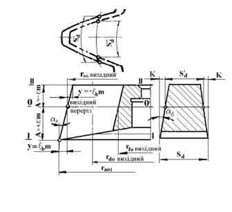 В інших, рідших випадках, за більших величин від’ємної вихідної відстані, може наступити підрізання зубців колеса. Якщо взяти до уваги, що число зубців, діаметр ділильного кола та кути різання довбача є конструктивними чи заданими елементами, то розрахунок довбача за суттю полягає у визначенні оптимальних вихідних віддалей, для конкретних умов оброблювання.
