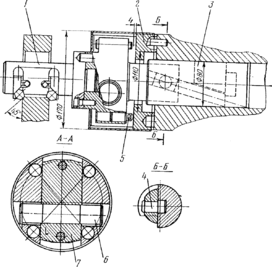 Для ілюстрації на рис. 12.19 наведена конструкція спеціальної коливної головки, призначеної для одночасного двостороннього розточування фасок кривошипної головки шатуна в автоматичній лінії. Влаштована вона таким чином. В паз корпуса 2 вмонтовано хитний на осі 6 тримач 7, до передньої частини якого закріплений різцетримач 1. Задня частина тримаючи закінчується півциліндричним хвостовиком (розріз Г- Г) зі вставленим в ньому пальцем 4. Подача оправи з різцями здійснюється косим пазом (кут 15°) повзуна 3. Величина ходу різццевої оправи обмежується двама регулювальими упорами 5, закрученими в держак.