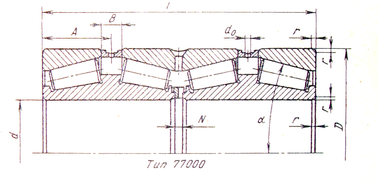 | Условное обозначе ние под шипника | d, мм | D, мм | Т, мм | r, мм | N, мм | В, мм | А, мм | d0, мм | α, º | Ролики | параметры | Масса, кг | ||||