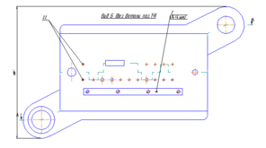 Конструктивной основой верхней подвижной части штампа является верхняя плита 3, прикрепляемая к ползуну пресса при помощи хвостовика 13. К верхней плите при помощи штифтов 21 и винтов 16 прикреплен пуансонодержатель 11 и пуансоны 7-10. Между пуансонами и верхней плитой установлена закаленная прокладка 5. Съемник 12 (крепится винтами 17) и резина 6 служат для съема полосы с пуансонов при ходе подвижной части штампа вверх после пробивки детали. Верхняя и нижняя части штампа ориентируются при помощи колонок 19 и втулок 18. Работает штамп следующим образом.