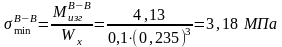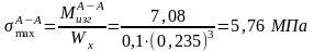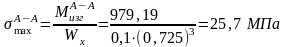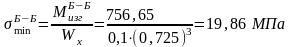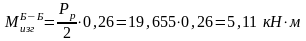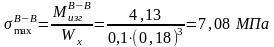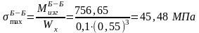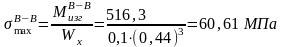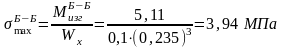 На рис. 2 изображены расчетная схема опорного валка и эпюры изгибающих моментов, и нормальных напряжений. Определим максимальные нормальные напряжения в сечениях А-А, Б-Б. Соответствующие значения изгибающих моментов и нормальных напряжений указаны на эпюрах: