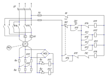 Пуск двигателя осуществляется в две ступени по заданному значению времени. Для реализации данного принципа предусмотрены реле времени постоянного тока KT1 и KT2 (типа РЭВ-301), катушки которых с помощью резисторов управления Rу1 и Rу2 настроены на срабатывание при определенной скорости. Пуск двигателя осуществляется нажатием кнопки SB1, что в свою очередь, приводит к срабатыванию контактора KM1 и подключению АД к сети. Двигатель начинает разбег с введёнными в цепь ротора резисторами. По мере разбега АД, растет его ЭДС и, соответственно, растет напряжение на катушках реле времени. При скорости ω1 срабатывает реле времени KT1 и через определенное время замыкает цепь контактора КМ2, контакты которого при срабатывании закорачивают первую ступень пускового резистора RД1. При скорости ω2 срабатывает реле времени KT2 и замыкает цепь контактора КМ3, контакты которого при срабатывании закорачивают вторую ступень пускового резистора RД2. Двигатель выходит на естественную характеристику и заканчивает свой разбег в точке установившегося режима.