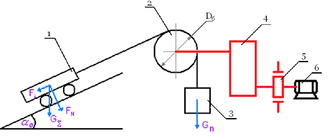 Грузоподъемная тележка, имеющая противовес движется по наклонному рельсовому пути под углом α к горизонту с помощью троса, перекинутого через барабан лебёдки.