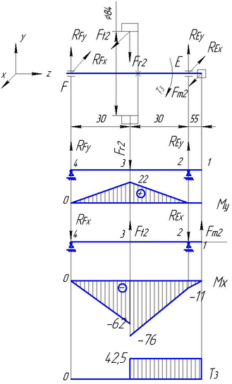ΣМ2x=0; Fm2·0,055- Ft2·0,03+ RFx·0,6=0;