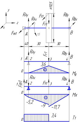 ΣМ4x=0; Fm1·0,1- RАx·0,06+ Ft1·0,03=0;