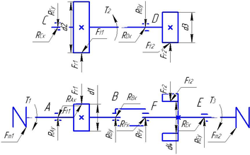 Схема усилий действующих на валы редуктора представлена на рис.2.