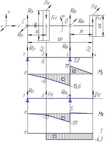 Рис.8 Эпюры изгибающих и крутящих моментов промежуточного вала.