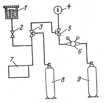 1 – емкость с галогенным соединением; 2,3,5 – вакуумные краны; 4 –образцовый мановакуумметр: 6 – газовый редуктор; 7 – вакуумный насос; 8 –баллон с готовой газогалогенной смесью; 9 – баллон с инертным газом.