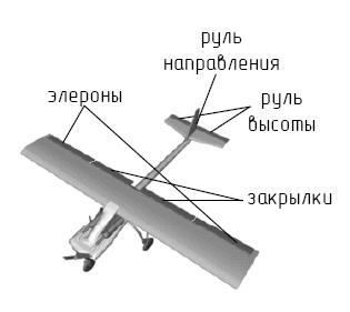 К входам системы относятся управляющие органы летательного аппарата и возмущения окружающей среды. Рассматриваемый самолет обладает органом управления тягой двигателя и аэродинамическими рулями: элероны, закрылки, руль направления и высоты (рис. 1). Так же на самолет влияет скорость ветра, температура и плотность окружающего воздуха.