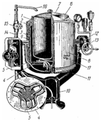 Рисунок 6 – Котел пищеварочный КПЭ – 60: 1 – варочный сосуд; 2 – наружный корпус; 3 – пароводяная рубашка; 4 – днище – диск наружного корпуса; 5 – тэны; 6 – носик; 7 – съемная крышка; 8 – наружный кожух; 9 – тепловая изолиния; 10 – чугунная вилкообразная станина; 11 – стойка станины; 12 – механизм для поворота котла; 13 – маховик с рукояткой; 14 – водопроводная труба; 15 – водозапорный вентиль; 16 – поворотная трубка – головка; 17 – кран уровня; 18 – манометр; 19 – двойной предохранительный клапан; 20 – заливная воронка.