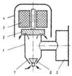 Рисунок 7 - Принципиальная схема устройства двойного предохранительного клапана: 1 – корпус; 2 – золотник парового клапана; 3 – грузовая втулка; 4 – крышка; 5 – рубашка котла; 6 – золотник вакуумного клапана; 7 – седло вакуумного клапана;