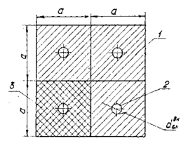 1- блок графитовой кладки; 2 – осевое отверстие для ТВС; 3 – площадь ячейки.
