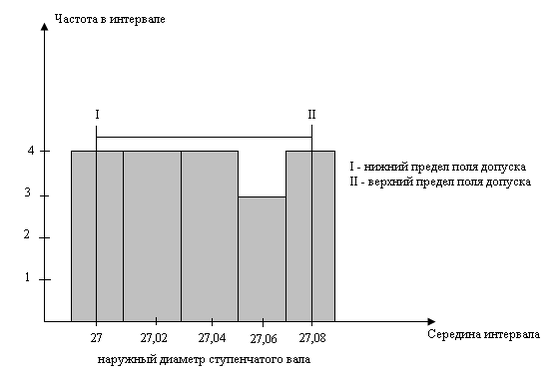 Затем строим гистограмму, представляющую собой метод представления данных, сгруппированных по частоте попадания в определенный (заранее установленный) интервал. При крайней простоте построения гистограмма дает много аналитической информации о разбросе качества средних значений различных параметров, точности и стабильности протекания технологического процесса, точности работы станков и оборудования. Далее разбиваем диапазон распределения наружного диаметра оси на равные интервалы.