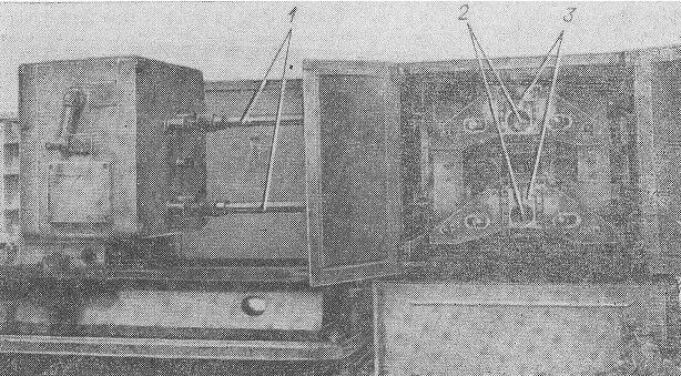 1-шпиндели для расточки отверстий под опоры червяка; 2-то же под опоры колеса; 3-корпуса редукторов