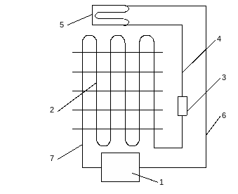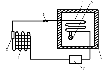 4 – испаритель; 5 – терморегулятор; 6 – шкаф; 7 – герметичный компрессор.