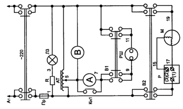 R — резистор 3,9 кОм; А — амперметр со шкалой на ЗА; AT— автотрансформатор типа ЛАТР-1М; В1, В2 — переключатели типа ТВ1-4; Кн1 — кнопка; ЛЗ — лампа типа КМ-48-50; М — компрессор типа ХКВ-6 с пусковым реле; Пр — предохранитель на 5 А; Р— реле пускозащитное типа LS-0.8B; РШ — розетка двухполюсная типа РД-1; В — вольтметр Э8003 со шкалой на 250 В.