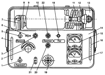 1, 5 — тумблеры; 2 — ручка автотрансформатора; 3 — предохранитель; 4,16— ручки; 6 — лампа; 7 — соединительный шнур; 8 — шнур; 9 — ключ герметичный; 10 — баллон со шлангом; 11 — шланг; 12, 20, 22— полумуфты; 13—мановакуумметр; 14—блок приборов; 15—амперметр; 17—вольтметр; 18—кнопка шунтирования амперметра; 19 — вентиль; 21 — розетка