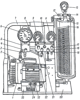 1 - вакуум-насос; 2 - газобалластный вентиль; 3, 12 - предохранительные клапаны; 4, 8, 17, 18, 21 - вентили; 5 - вакуумный блок; 6 - вакуумметр; 7 - ручка; 9 - мановакуумметр; 10 - смотровое стекло; 11, 13 - манометры; 14 - обратный клапан; 15-цилиндр для хладагента; 16 - шкала цилиндра; 19, 22 - штуцера; 20 - станина; 23, 24 - тумблеры; 25 - электрический щиток