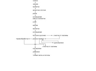 Широкий сортамент непрерывных полунепрерывных станов (толщина полос от 0,8-1,2 до 16-25 мм., ширина до 2350 мм.), Высокая производительность и другие технико-экономические показатели обеспечили их преимущественное применение и развитие для производства горячекатаной полосовой стали. В последней клети непрерывных станов достигнута скорость прокатки 27 м/с, предусматривается увеличение до 30 м/с. Суммарная мощность главных приводных двигателей до 150000 кВт, масса оборудования до 40000 т. Широкополосные станы горячей прокатки состоят из двух групп рабочих клетей: черновой и чистовой, расположенных последовательно и связанных между собой рольгангами. Производительность и технологию прокатки определяют в основном характеристика и состав оборудования черновой и чистовой групп стана. На рисунке 1 приведена схеме прокатного производства [5].