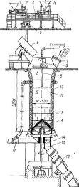 4—водоохлаждаемая балка; 5—гляделки; 6—отверстия датчиков уровнемера шихты; 7—скиповый подъемник; 8— загрузочное устройство;
