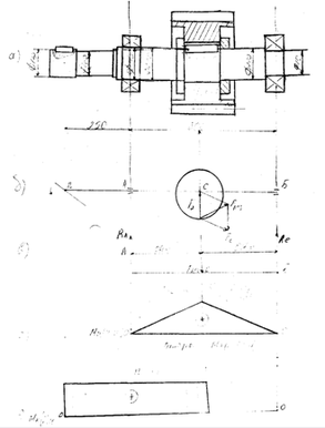 [Sf] - коэффициент безопасности; [Sf] = [ [Sf]' = 1,75; (3) - С.45, табл. 3.9; [Sf]"2 - коэффициент, учитывающий влияние на изгибную выносливость способа получения заготовки; [Sf]" =1,3 - для литых заготовок; Определим отношение [δf]1/ Y1 - для шестерни и [δf]2 /Y2 для зубчатого венца; где Y1 и Y 2 -коэффициенты, учитывающие форму зуба; Y1 - 4,09; Y2=3,6; - расчёт зубьев на изгиб ведём по зубчатому венцу. Определяем расчётные напряжения изгиба: KF2 - коэффициент нагрузки; KF2= KFβ × Kfv; (3) - C.42; KFβ - коэффициент неравномерности распределения нагрузки, зависит от Хво = b2/d2= =315/4500 = 0,07; KFβ =l. Kfv - динамический коэффициент; Kfv = 1,25; Kf2 = 1 × 1,25 = 1,25. Выносливость зубьев на изгиб обеспечена, т. к. δf2 = 28,5 МПа < [δf]2 = 44,6 МПа. 5.5 Расчёт деталей машины на прочность 5.5.1 Расчёт вала подвенцовой шестерни Исходные данные: передаваемый валом вращающий момент-Т= Т2 = 13446 Н.м =13446 ×103 Н.мм; угловая скорость ω =ω2= 3,86 рад/с; окружная сила на шестерне -Ft = 49,8 × 103 Н; радиальная сила на шестерне -Fr= 18,1 × 103Н; Проектировочный расчёт Определяем диаметр конца вала (под полумуфту) из расчёта только на кручение: где Мк - крутящий момент, действующий в сечениях конца вала, Н.мм; Мк=T= 13446 × 103 Н.мм; [ĩ]к - допускаемое напряжение кручения, МПа (н/мм2); [ĩ]к = 20.. .30 н/мм2; принимаем [ĩ]к = 30 МПа (н/мм2) принимаем по ГОСТ 6036-69 d =150 мм. Проверочный расчёт вала Вычерчиваем схему подвенцовой шестерни и назначаем диаметры шеек вала (см.рис. 5.4а): слева - направо: d1 = 150 мм - под посадку полумуфты; dп = 170 мм - под посадку подшипников; dш =190 мм - под посадку подвенцовой шестерни. Вычерчиваем расчётную схему вала (рис. 7.46). На шестерню действуют взаимно перпендикулярные окружная Ft и радиальная Fv силы. Заменим их действие на вал действием результирующей силы: Сила Fрез пересекает ось вала в точке "С" под прямым углом. Повернём вал так, чтобы Fрез была направлена вертикально и вычертим расчётную схему (см. рис. 7.4в). На вал действует плоская система сил Fрез, реакции подшипников Ra и Re. Т. к. сила Fрез расположена на одинаковом расстоянии от подшипников А и Б, то их реакции направлены, как показано на схеме, и равны: Ra = Rb = Fрез/2 = 53 × 103/2 = 26,5 × 103 Н = 26,5 КН. Выбираем для изготовления вала сталь 45 ГОСТ 1050-88, имеющую следующие механические свойства: предел прочности δв = 890 МПа (н/мм2), предел текучести δт = 650 МПа (н/мм2), предел выносливости по нормальным напряжениям δ-1 = 380 МПа (н/мм2), предел выносливости по касательным напряжениям ĩ -1 = 0,58 × δ-1=0,58 × 380 = 220 МПа (н/мм2), средняя твердость - 285 НВ, термообработка -улучшение. Определяем изгибающие моменты в сечения вала: Миа = Мив = Миб = 0; Мис = Ra × 0,4 = 26,5 × 10з × 0,4 = 10,6 × 103Н.м. Строим эпюру изгибающих моментов (рис. 5.4г). Вращающий момент передаётся от середины ступицы полумуфты, насаженной на крайнюю левую шейку вала (см. рис. 5.4) до середины подвенцовой шестерни по часовой стрелке (если смотреть со стороны полумуфты). Под его действием в сечениях вала на участке ВС возникают крутящие моменты, одинаковые в каждом сечении и равные: Мк = Т - 13446 Н.м. Строим эпюру крутящих моментов (рис. 5.4д). Как видно из эпюр Ми и Мкр, опасным является сечение вала в точке "С" диаметром d=220 мм = 0,22 м. Определяем действующие в нём напряжения: изгиба – кручения – Напряжения изгиба изменяются по симметричному циклу с амплитудой, равной: δа = δи = 10,0 МПа, (н/мм2). Напряжения кручения изменяются по отнулевому циклу с амплитудой, равной: ĩа = ĩк/2 = 6,3/2 = 3,15 МПа. В сечении вала "С" - два концентрата напряжения: шпоночны