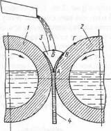 Размер кристаллов циркониевого электрокорунда зависит от условий охлаждения расплава. Так, по данным ВНИИАШа, с увеличением скорости охлаждения расплава от 12—20 до 1000— 2000 °С/мин размер первичных кристаллов уменьшается с 300—400 до 30—10 мкм и растет число участков эвтектического строения. Скорость охлаждения расплава можно изменять, разливая его в металлическую изложницу, аналогичную изложнице такой же емкости, но с металлическими шарами, ускоряющими охлаждение расплава, и на валках-кристаллизаторах. В последнем случае расплав из печи поступает в зону формирования ленты, образуемую усилием прижима двух охлаждаемых валков (рис. 2.43), вращающихся навстречу друг другу. На поверхности каждого из вращающихся валков / и 2 образуются твердые "корочки" расплава, которые, встречаясь в точке А (см. рис. 1), сливаются (свариваются) в одну общую "корочку" — твердую полосу циркониевого электрокорунда. Температура расплава в печи при этом составляет 2323— 2373 К, в струе — 2173—2253 К, а в зоне формирования полосы 4 в клине расплава 3 между валками — 2123—2163 К. Оптимальная скорость формирования электрокорундовой полосы в этих условиях составляет 0,17 м/с, а ее толщина— 2,5— 3,5 мм. Выход крупного шлифзерна (размер частиц 2—1 мм) из такой полосы составляет 65,3 %, а насыпная масса его изменяется в пределах 2010—1920 кг/м3. Сравнительная характеристика химического состава и некоторых свойств зерен циркониевого электрокорунда отечественного производства, полученного из различных шихтовых материалов и охлажденного в валках-кристаллизаторах, по сравнению с зарубежными аналогами приведена в табл. 2.