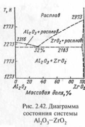 Циркониевый электрокорунд будем рассматривать как продукт кристаллизации двойной системы. В этой системе, по данным Г. Вартерберга, при массовой доле ZrO2, равной примерно 40 %, появляется эвтектика с температурой плавления 2193 К. Р.Ф. Геллер определил наличие эвтектического сплава при массовой доле в нем ZrO7, равной 55 %, с температурой плавления 2158 К. Поданным японских исследователей температура плавления эвтектики составляет 2163 К. А.С. Бережной, исследуя систему А17О3—ZrO^, построил расчетную диаграмму состояния (рис. 2.42), согласно которой массовая доля ZrO2 в эвтектическом сплаве составляет 32 %, а температура его плавления 2183 К.