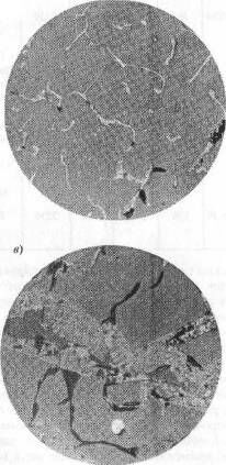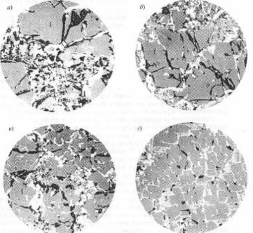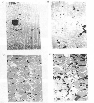 в слитках толщиной 25 мм (свет отраженный; х200) {а— краевая зона; б— центр) и 60 мм (в— краевая зона; г— центр):