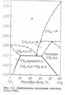 В системе ZrO2 — TiO2 (рис. 9.3) образуется одно соединение ZrO2-TiO2 с широким интервалом гомогенности. Имеются области твердого раствора TiO2 в ZrO2 и твердого раствора ZrO2 в TiO2. Расворимость TiO2 в ZrO2 определяли методом высокотемпературного твердофазного взаимодействия. Порошки исходных веществ готовили с осаждением из раствора, прессовали в стальной форме и отжигали на воздухе при 1300 °С в течение 792 ч, при 1400 °С 360 ч и при 1500сС 288 ч. Растворимость TiO2 в тетрагональном ZrO2T, определения рентгенофазовым и дифференциальным термическим анализом, составила 13,8±3% при 1300 °С, 14,9±0,2% при 1400 °С и 16,1 ±0,2% при 1500 °С. При охлаждении до комнатной температуры эти твердые растворы превращаются в мета-стабильные моноклинные твердые растворы без изменения состава.