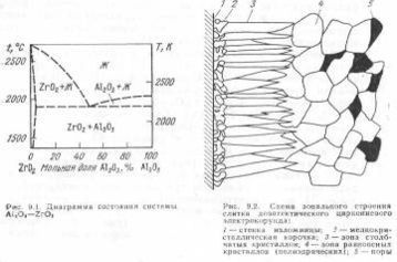 Диаграмма состояния системы А12О3 — ZrO2 относится к простым эвтектическим (рис. 9.1). Координаты эвтектической точки точно не установлены и по данным различных авторов колеблются в пределах 32—55% ZrO2 и 1983—2193 К.