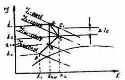 Для нахождения точки Д – параметров воздуха после калорифера, необходимо найти отношение Δ/l, отложить в масштабе отрезок соответствующий Δ/l от точки С вверх (при Δ/l отрицательном) по линии X = const. Получим точку С1 параметры воздуха на выходе из камеры в случае теоретической сушилки. Пересечение линии