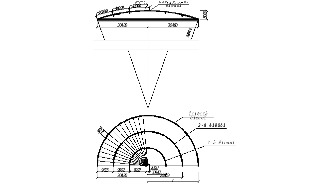 Половину дуги следует разделить на целое число ярусов щитов покрытия и выделить радиус верхнего центрального кольца. Примем длину щита по дуге окружности l0щ=10,0м, при этом радиус центрального кольца согласно рис. 2