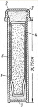 Рис. 3. Реакционная бомба для восстановления хлоридов лантаноидов кальцием: 1 — стальная трубка диаметром 6,35 см; 2 — стальная крышка; 3 — набивка из СаО; 4 — футеровка из спеченного огнеупора; 5 — набивка СаО; 6 — шихта