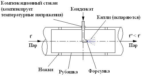 Регулирование tne осуществляется пароохладителями .Обычно используются пароохладители впрыскивающего типа (рис. 1.2). Они представляют собой участок паропровода, внутрь которого при помощи форсунок впрыскивается охлаждающая среда. Снижение температуры происходит за счет испарения капель среды. На участке, где происходит испарение, внутри трубопровода есть защитная металлическая рубашка – нужна, чтобы капли не попадали на