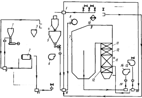 В котельных установках, работающих на пылевидном топливе, осуществляется также регулирование работы пылеприготовительной системы регулятором V загрузки мельниц, обеспечивающим постоянство загрузки шаровых барабанных мельниц и регулятором VI температуры пылевоздушной смеси за мельницей. Для предупреждения персонала о недопустимости отклонения важнейших параметров котельной установки от заданных служат звуковые и световые сигнализаторы предельных уровней воды в барабане, предельных температур перегретого пара и низшего давления питательной воды.