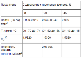 среднемассовая мол. масса). Макромолекулы бутадиен-стирольных каучуков имеют разветвленное строение. Каучуки содержат значит. кол-no микрогеля. Их ненасыщенность составляет, как правило, до 90% от теоретической. Бутадиен-стирольные каучуки растворяются в ароматич., алициклич. и алифатич. углеводородах. Многие физ. св-ва каучуков зависят от содержания в них стирольных звеньев (см. табл. 1).