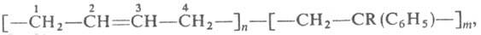 Дивинил-стирольные каучуки, стирольные каучуки, БСК, СКС, СКМС, ДССК, америпол, интол, карифлекс, крилен, нипол, плайофлекс, SBR, синпол, солпрен, стереон, тьюфден, филпрен, юниден), сополимеры бутадиена со стиролом илиметилстиролом общей формулылы: