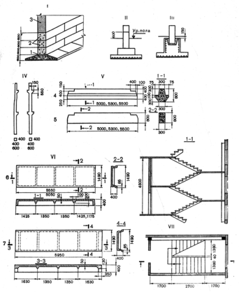 I — сборные фундаменты под стену; 1 — железобетонные блоки-подушки; 2 — бетонные блоки; 3 — стены; II — фундаменты под колонны ступенчатого типа; III — фундаменты под колонны стаканного типа; IV — крайняя и средняя колонны многоэтажного здания; V — ригеля (главные балки) междуэтажного перекрытия; 4 — с консольными полками для опирания настилов; 5 — прямоугольного сечения; VI — настилы междуэтажного перекрытия: 6 — корытный, укладываемый на полки ригелей; 7 — лотковый, укладываемый поверх ригелей; VII — разрез и план четырехмаршевой лестничной клетки
