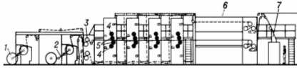 Рис. 6. Схема многокрасочной рулонной офсетной машины: 1 - рулон бумаги; 2 - рулонная звезда; 3 - стабилизатор натяжения; 4 - формные цилиндры; 5 - офсетные цилиндры; 6 - сушильные установки; 7 - фальцаппарат.