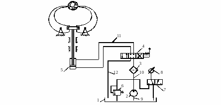 Рис. 1. Схема гидравлическая принципиальная механизма зажима бревна гидравлической тележки ПРТ8 - 2: 1 – гидробак; 2 – насос; 3 – фильтр; 4 – гидрораспределитель; 5 – гидроцилиндр; 6 – клапан предохранительный; 7 – золотник включения манометра; 8 – манометр; 9 – всасывающая линия; 10 – напорная линия; 11 – исполнительная линия; 12 – сливная линия.