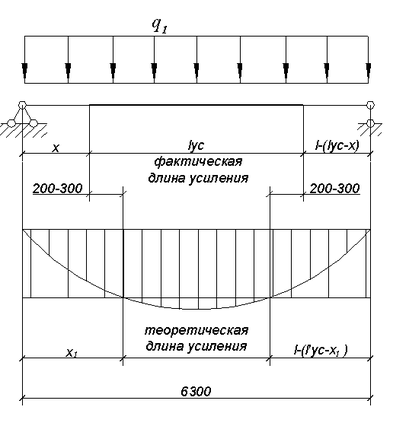 Фактическую длину элементов усиления принимаем несколько больше теоретической (на 200-300 мм с каждой стороны) для обеспечения полного включения элементов усиления в работу балки.