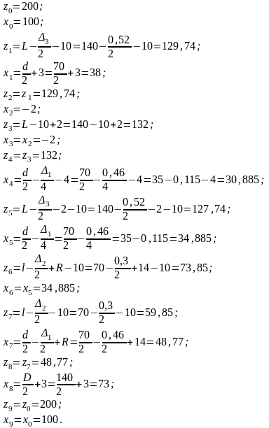 На эскизе изображается траектория инструмента с пронумерованными опорными точками. Опорные точки располагают в местах смены траектории режущего инструмента, изменения геометрического элемента траектории (прямая, дуга окружности и др.) или скорости подачи, например, переход с быстрого хода на рабочую подачу и наоборот. Для размеров, где не указаны допуски, рекомендуется их симметричное расположение.