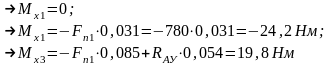 ∑МВ=0; -Fn1·0,139-Fr1·0,054+RАY·0,108 =0;