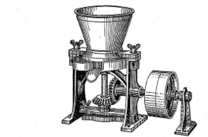 Жерновая мельница имеет два жернова, верхний отлит вместе с загрузочной воронкой, неподвижен, нижний вращается в горизонтальном направлении. На поверхности жерновов имеются бороздки, более глубокие в центре, у краев исчезающие. Мазь гомогенизируется в просвете между жерновами и выдавливается к краям, где с помощью скребка собирается в приемник. Степень дисперсности частиц в мази определяется расстоянием между жерновами. Производительность мельницы 60-80 кг/ч.